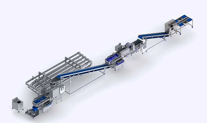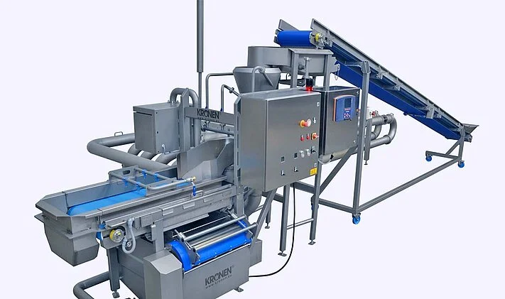 The submergence flume ensures that the pre-washed product from an upstream washing machine is reliably and gently fed into the pipe system of the Vortex.