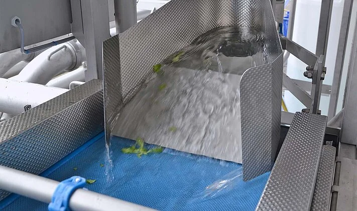 The Vortex system disinfects cut or whole products such as whole carrots or even cut salad mixes with high capacity. For this purpose, a washing additive is used. In order for the additive to reliably achieve germ reduction on the products, the Vortex ensures complete rinsing of the products for a defined time.