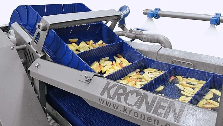 In the KDB 120 dipping bath, cut fruit and vegetables are treated with a minimum amount of water and therefore also a reduced amount of additives in order to increase shelf life and reduce the germ load on product surfaces.