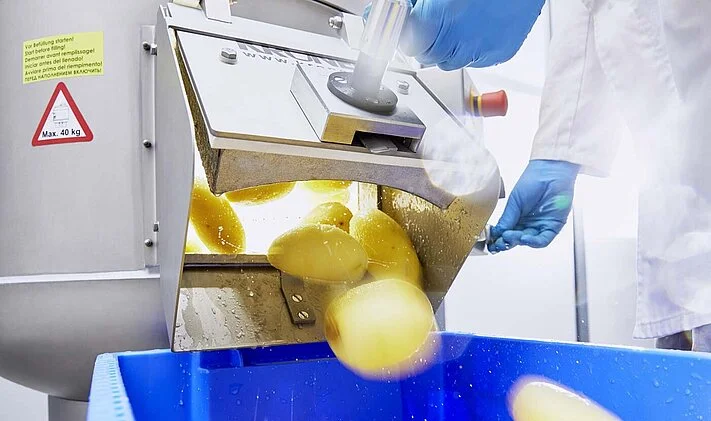Robust and proven technology for the gentle and systematic peeling and washing of potatoes, carrots, beetroot, cabbage turnips (kohlrabi) and other tuber vegetables.